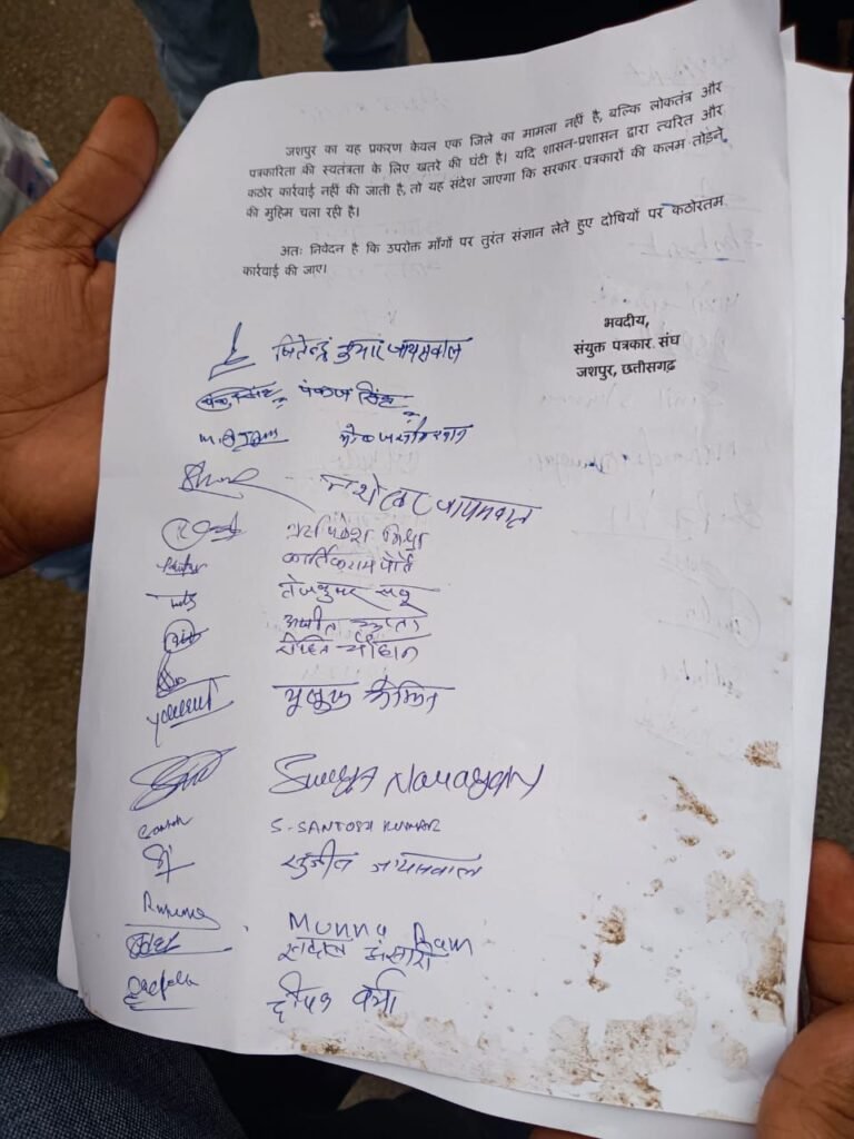 मुख्यमंत्री के गृह ज़िले जशपुर में पत्रकारों पर नोटिस थोपने और मानहानि का मुकदमा दर्ज कराने की धमकी के विरोध में जिलेभर के पत्रकार संगठनों ने शुक्रवार को ज़िला कलेक्टर कार्यालय पहुंचकर जोरदार विरोध दर्ज कराया। इस दौरान उन्होंने कलेक्टर के माध्यम से मुख्यमंत्री को एक ज्ञापन सौंपा, जिसमें जनसंपर्क विभाग की सहायक संचालक नूतन सिदार के खिलाफ कठोर कार्रवाई की मांग की गई है।