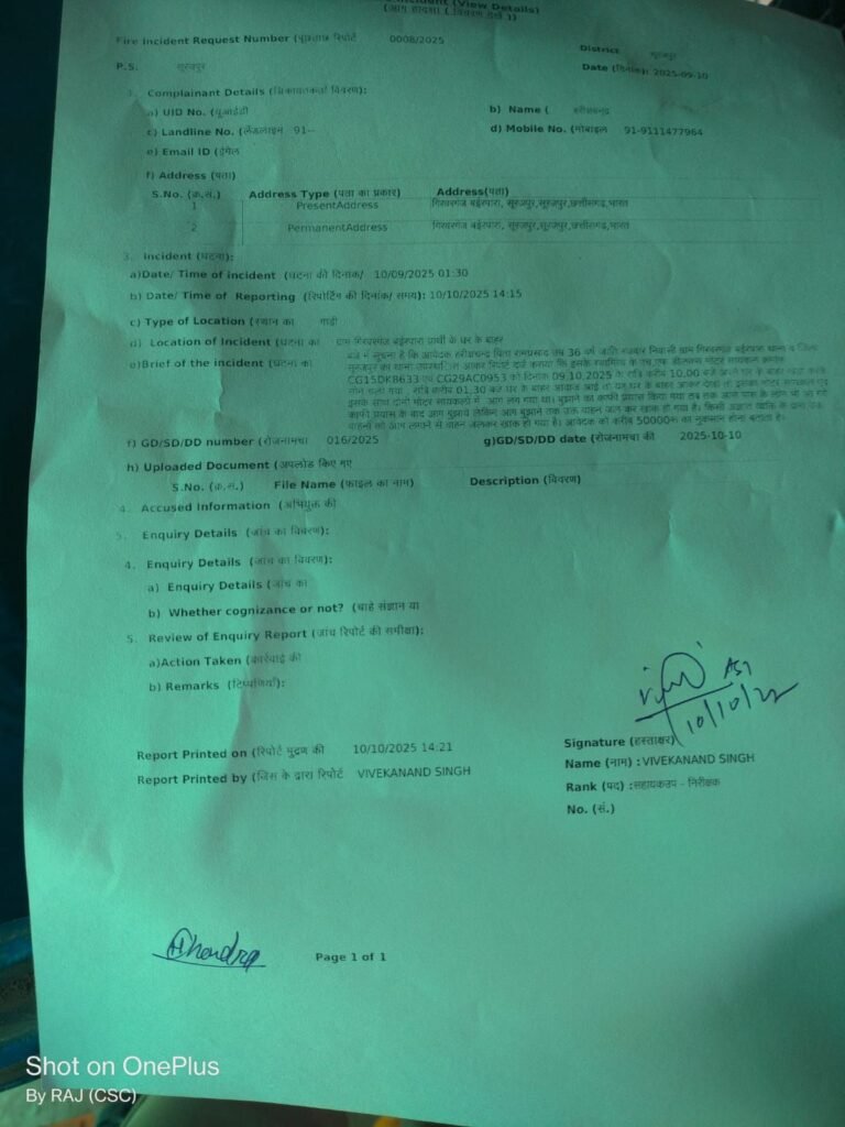 जानकारी के अनुसार ग्राम निवासी हरिशंकर पिता राम प्रसाद के घर के बाहर खड़ी दो मोटरसाइकिलें — क्रमांक CG15 DK 8633 और CG29 AC 0953 — बीती रात लगभग 1:30 बजे अज्ञात व्यक्ति ने आग के हवाले कर दी l अचानक लगी आग की लपटें देखकर घरवाले व आसपास के लोग मौके पर पहुंचे और आग बुझाने का प्रयास किया, लेकिन तब तक दोनों वाहन पूरी तरह जलकर खाक हो गए।