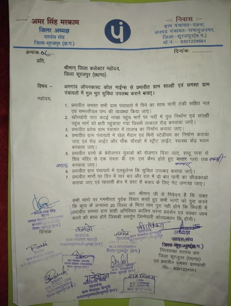 ज्ञापन में बताया गया कि कोल माइंस के कारण आसपास के गांवों में कई प्रकार की समस्याएं उत्पन्न हो रही हैं। ग्रामीणों को पीने के साफ पानी, सड़क, स्वास्थ्य और रोजगार जैसी मूलभूत सुविधाओं की कमी का सामना करना पड़ रहा है। इस संबंध में प्रशासन से कई महत्वपूर्ण मांगें की गई हैं।