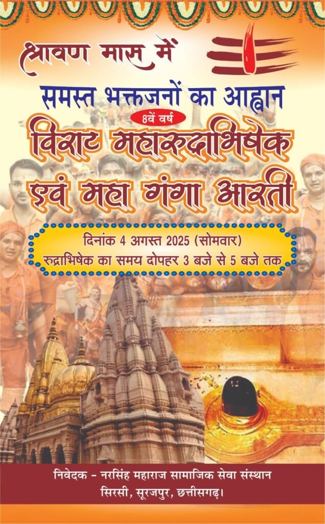 सूरजपुर, 3 अगस्त 2025। सावन के पवित्र माह में सूरजपुर के सिरसी में नरसिंह महाराज सामाजिक सेवा संस्थान द्वारा विराट महारुद्राभिषेक और महा गंगा आरती का आयोजन 4 अगस्त 2025 सोमवार को होने जा रहा है। इस पावन अवसर पर भक्तगण पार्थिव शिवलिंग पूजन के साथ भगवान शिव की कृपा प्राप्त करेंगे। रुद्राभिषेक का समय दोपहर 3 बजे से 5 बजे तक निर्धारित है।