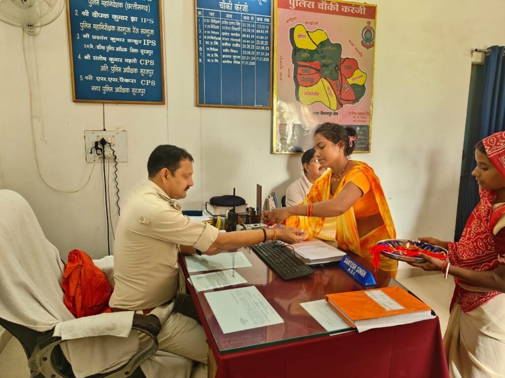 शुक्रवार, 08 अगस्त 2025 को एसआरव्हीएम के स्कूली छात्राएं थाना सूरजपुर पहुंची और थाना प्रभारी सूरजपुर विमलेश दुबे, एएसआई संजय सिंह सहित अन्य पुलिस अधिकारी व जवानों की कलाई पर रक्षा सूत्र बांधा। छात्राओं ने राखी बांधने के साथ ही आरती उतारी और तिलक कर अधिकारियों के प्रति आदर भाव प्रकट किया। उन्होंने सभी के उत्तम स्वास्थ्य, सुरक्षा और सुदीर्घ जीवन की मंगलकामना की। इस दौरान थाना प्रभारी विमलेश दुबे ने नन्हीं बहनों को कहा कि हम आपकी सुरक्षा के लिए पूरी तत्परता से तैनात है, आपको कभी भी कोई भी समस्या हो तो हमें याद कर सूचित करें हम फौरन वहां पहुंचेंगे, आपकी सुरक्षा हमारी प्राथमिकता है। थाना प्रभारी ने उपस्थित छात्र-छात्राओं को पुलिस की कार्यप्रणाली से अवगत कराते हुए थाना का भ्रमण कराया और सुरक्षा उपकरणों, ऑनलाईन एफआईआर, शस्त्रागार एवं वायरलेस सेट आपरेट करने के बारे में जानकारी दी।