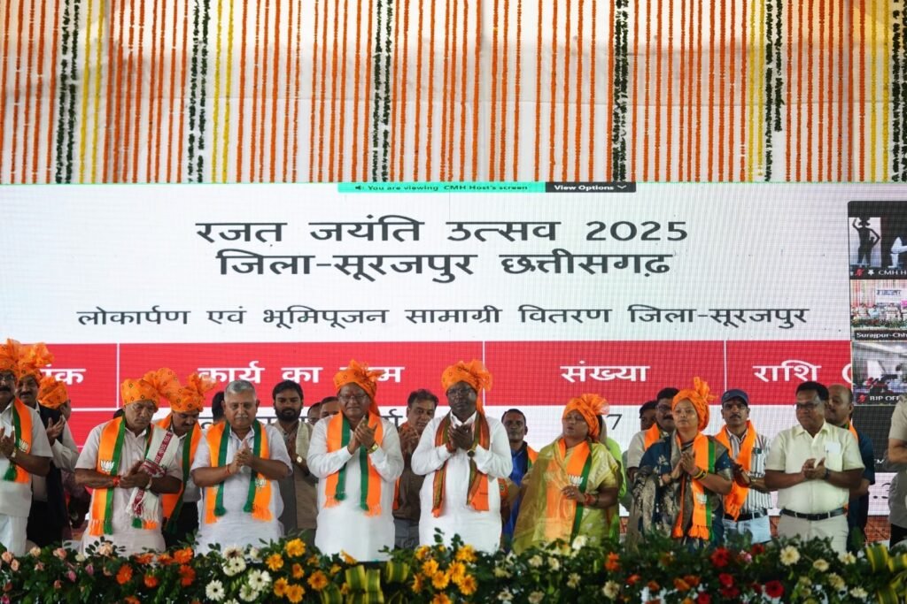 सुरजपुर / छत्तीसगढ़ राज्य के स्थापना के 25 वर्ष पूर्ण होने के गौरवशाली अवसर पर आज जिला प्रशासन सूरजपुर द्वारा तिलसिवां में छत्तीसगढ़ रजत महोत्सव कार्यक्रम का शुभारंभ एवं विकास कार्यों के लोकार्पण-शिलान्यास समारोह का आयोजन किया गया। मुख्य अतिथि के रूप में मुख्यमंत्री विष्णु देव साय ने कार्यक्रम की वर्चुअल रूप में कार्यक्रम की अध्यक्षता की। समारोह में विधायक भूलन सिंह शकुंतला सिंह पोर्ते, वन विकास निगम अध्यक्ष राम सेवक पैकरा ने भी सभा को संबोधित किया और छत्तीसगढ़ की प्रगति यात्रा में वाजपेयी जी के योगदान को याद किया। इसके अलावा कार्यक्रम में जिला पंचायत अध्यक्ष चन्द्रमणि पैकरा, जनपद पंचायत अध्यक्ष स्वाति सिंह एवं सरपंच बिमला सिंह सहित बड़ी संख्या में जनप्रतिनिधिगण, सरगुजा संभागायुक्त नरेंद्र दुग्गा, सरगुजा आई जी दीपक झा, कलेक्टर एस जयवर्धन, जिला पंचायत सीईओ विजेंद्र सिंह पाटले सहित जिला स्तरीय अधिकारी-कर्मचारी, मीडिया प्रतिनिधि एवं आम नागरिक उपस्थित रहे।